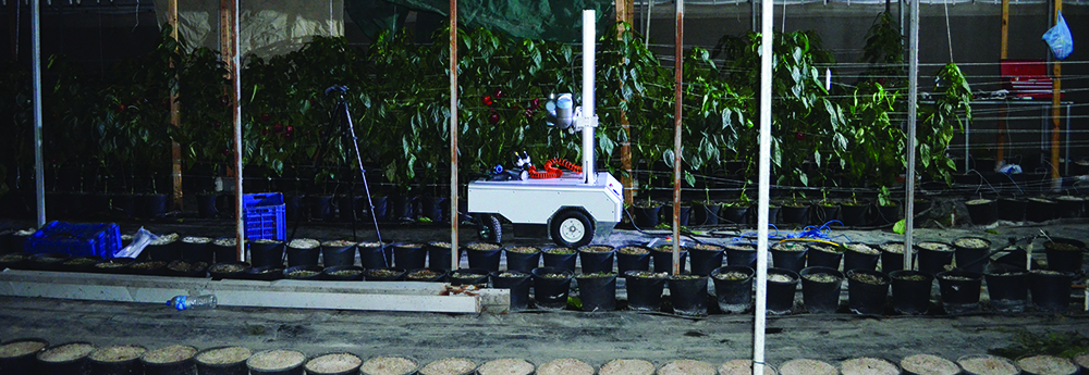 ▴ Harvey, the capsicum-picking robot, in action at a protected cropping facility.