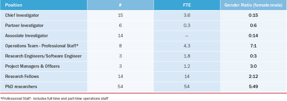 We have to acknowledge that all our Centre investigators are male, reflecting significant gender imbalance. These imbalances are acute in computer science and only slightly better in engineering. We are actively pursuing ways to redress this, by employing a number of tactics, such as addressing unconscious bias in advertising when recruiting for research fellows and PhD researchers.
