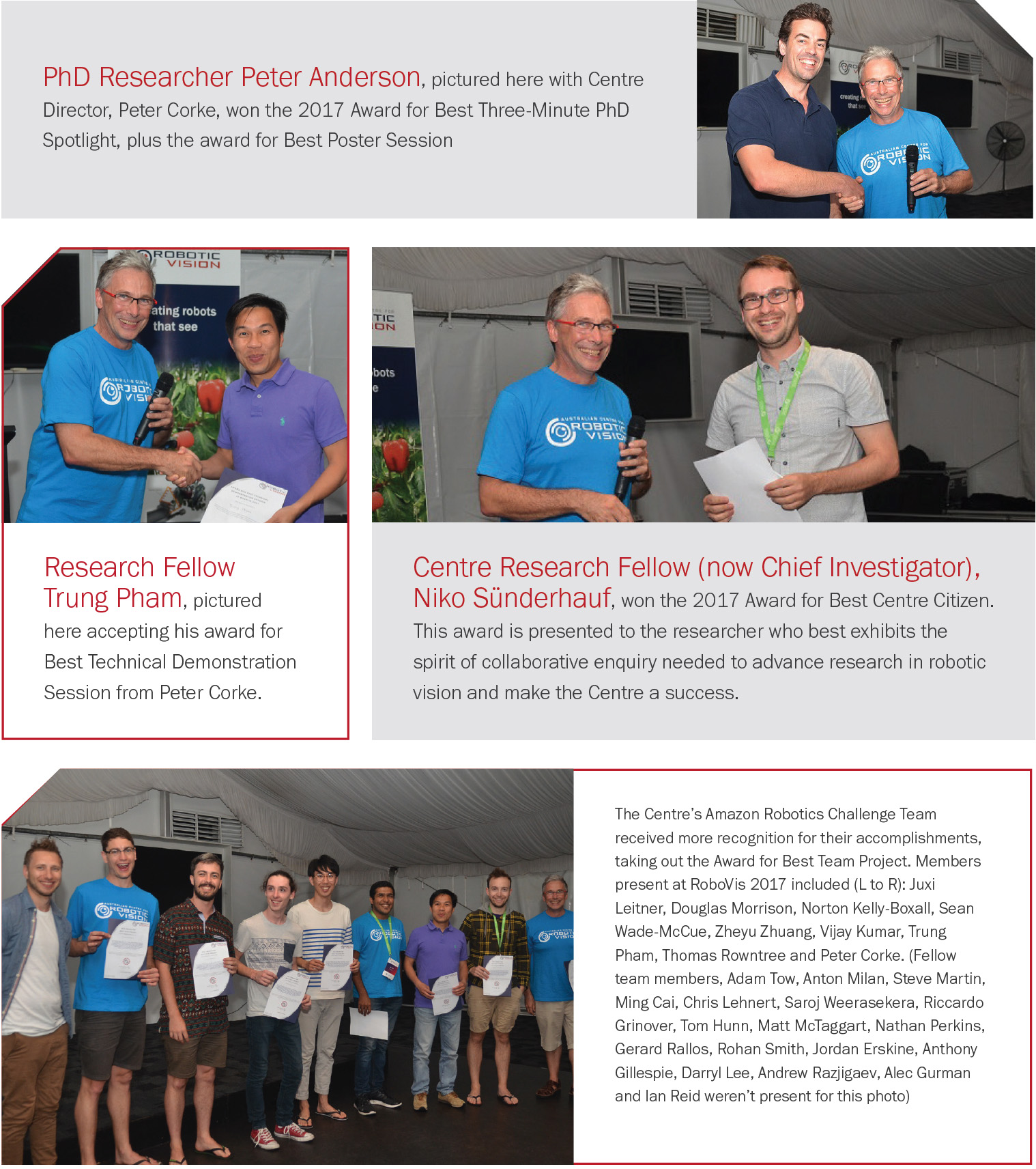 RoboVis 2017 included guest speakers, a technical program, three-minute thesis spotlights, technical demonstration sessions and a research poster session. Highlights of the event included a “Women in STEM” breakfast forum with QUT’s Mathilde Desselle and an industry presentation from PwC’s Trent Lund, who is also a member of the Centre’s End-User Advisory Board. We enjoyed some socialising with a trivia night, a bonfire night, wild dolphin feeding, along with the eagerly anticipated presentation of the 2017 Centre Awards.
