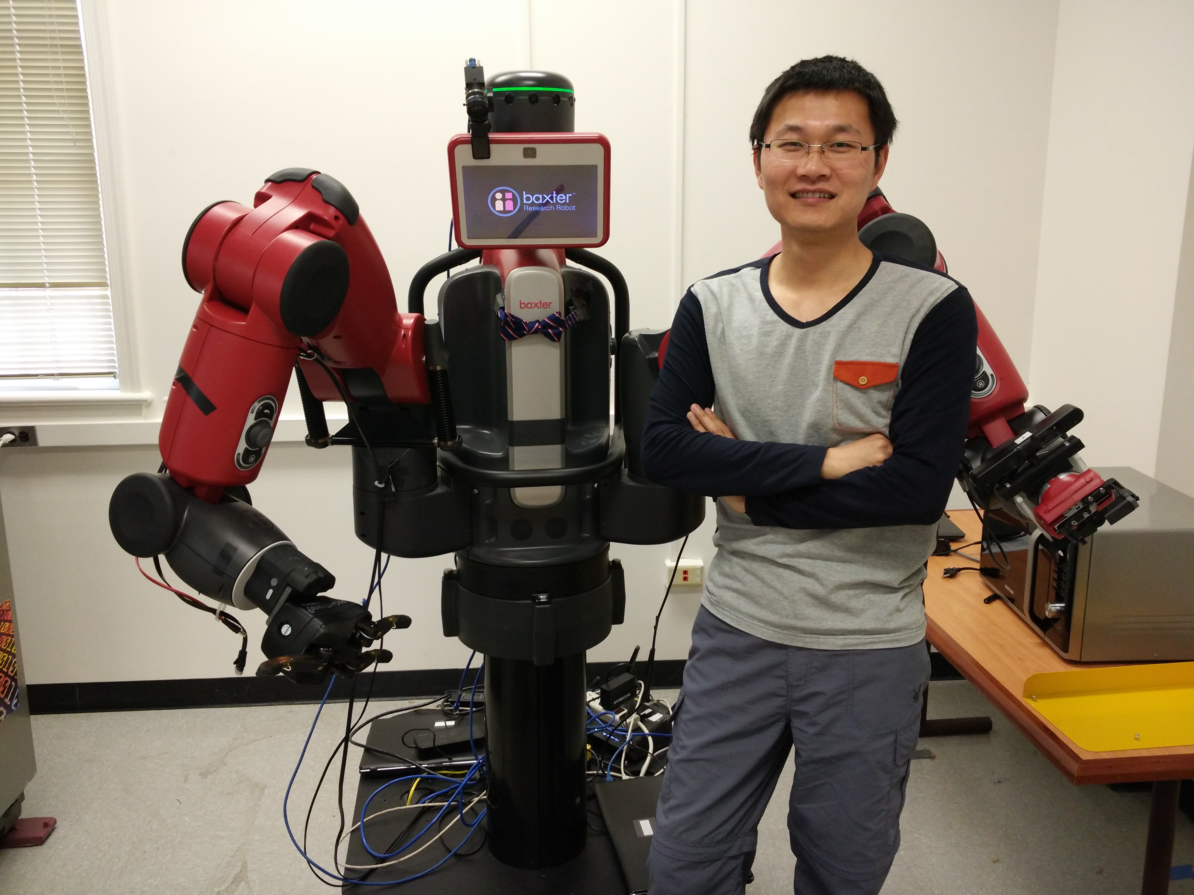 Centre PhD Researcher Fangyi Zhang pictured with a Baxter robot during his internship at the University of Maryland.