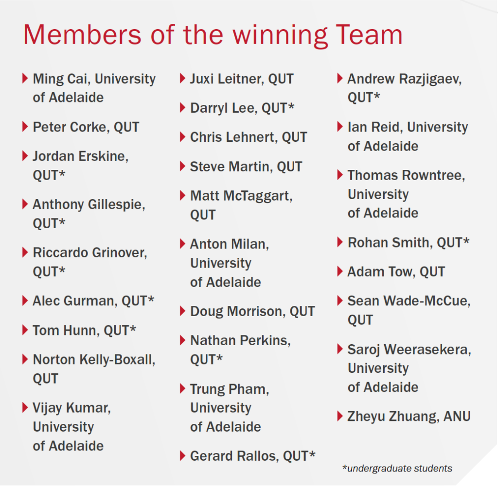 Research team: Peter Corke (CI), Jonathan Roberts (CI), Jochen Trumpf (AI), Alex Martin (RE), Juan Adarve (PhD), Peter Kujala (PhD), Sean O’Brien (PhD), Jean-Luc Stevens (PhD), Dorian Tsai (PhD)